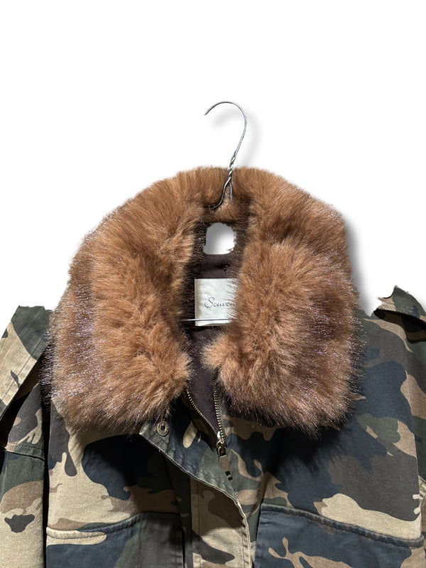 Parka corto in tela di cotone camou con colletto e polsini in eco fur, coulisse, maxi tasche.