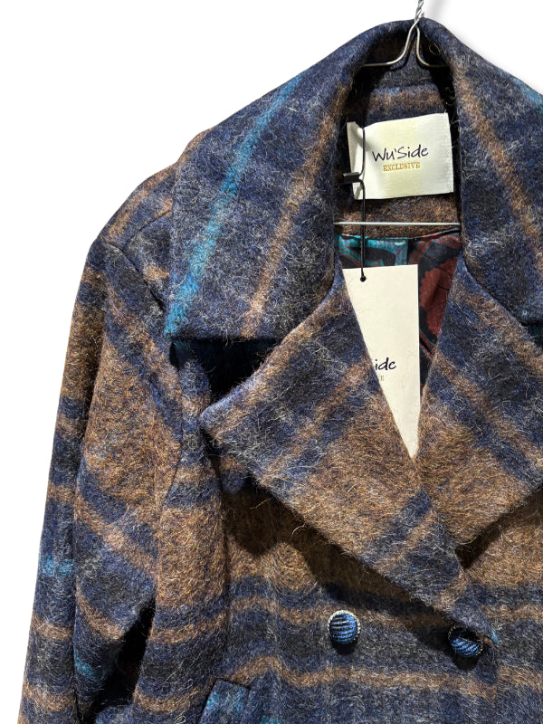 Cappotto corto a quadri check blu e marroni, bottoni gioiello, maxi revers, fodera fantasia.