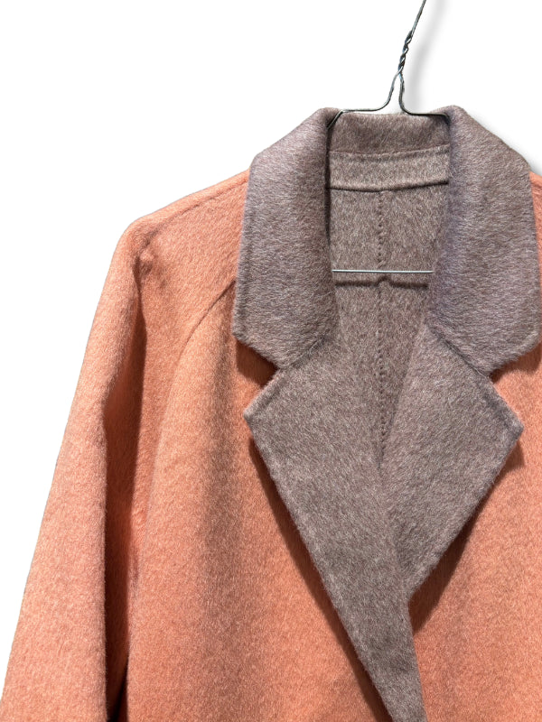 Cappotto double face over in punto pelliccia rosa e tortora, doppiopetto, modello over.