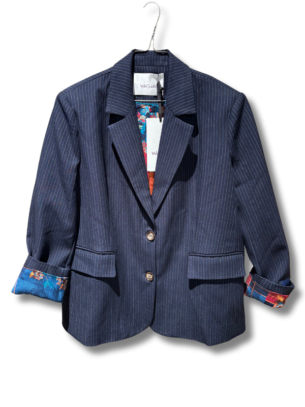 Giacca in panno blu gessato con fodera fantasia, modello dritto monopetto.