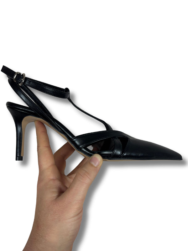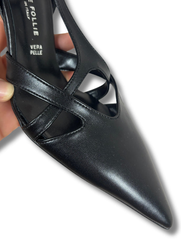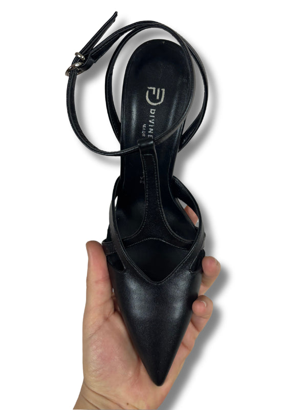 Decolletè in pelle nera con lavorazione intrecciata sul davanti, laccino alla caviglia, tacco fine 6 cm. Disponibili in più varianti.