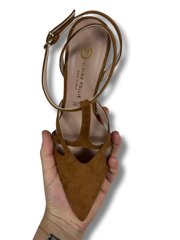 Decolletè in camoscio tabacco con lavorazione intrecciata sul davanti, laccino alla caviglia, tacco fine 6 cm. Disponibili in più varianti.
