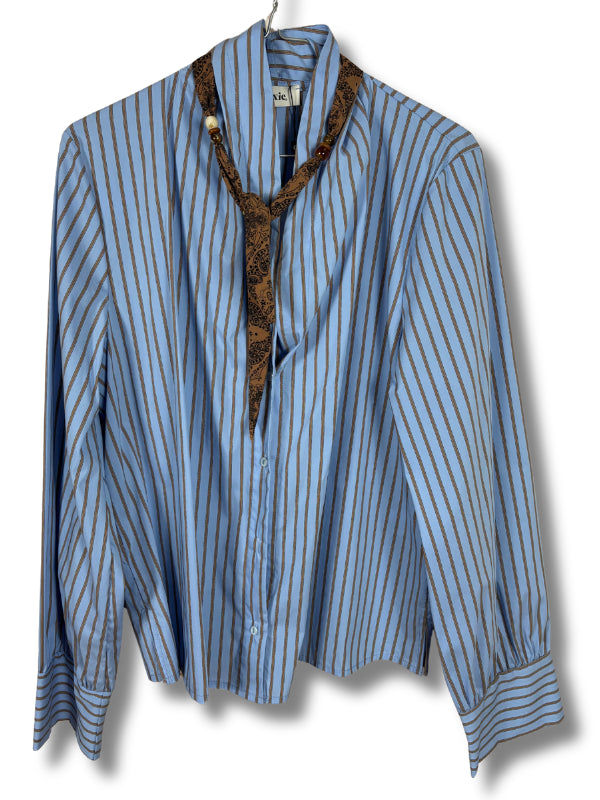 Camicia in popeline di cotone celeste a righe, scollo a V con bandanina, manica lunga con polsino.
