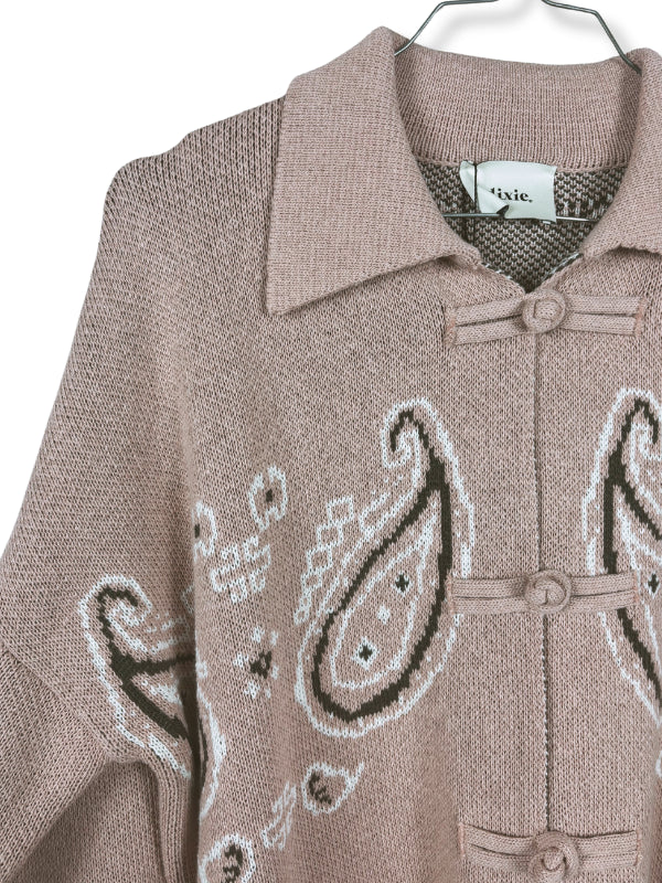 Cardigan in cotone rosa con lavorazione jaquard e frange, chiusura con alamari e tasche applicate.