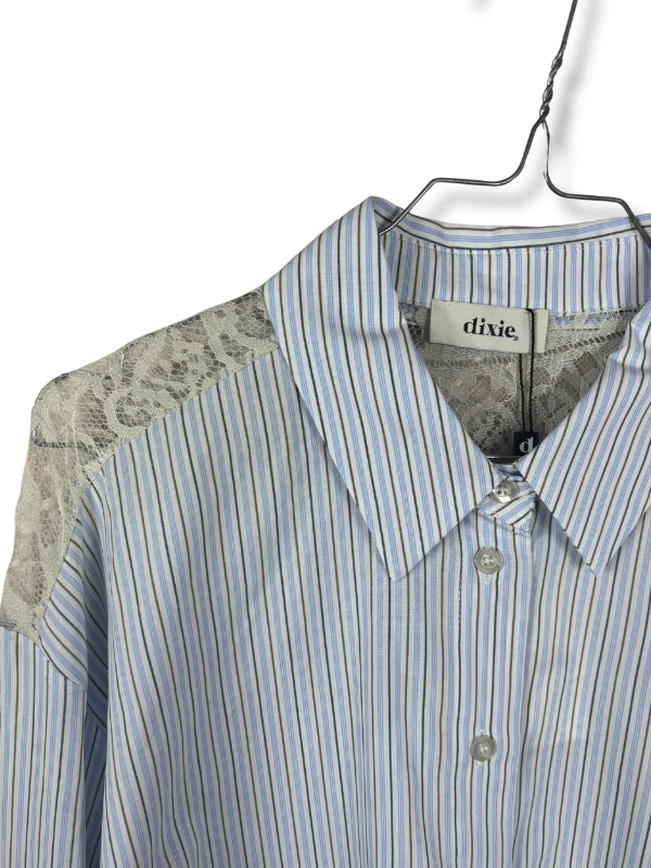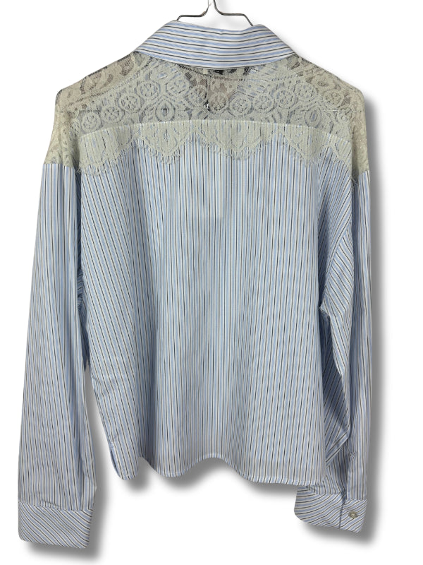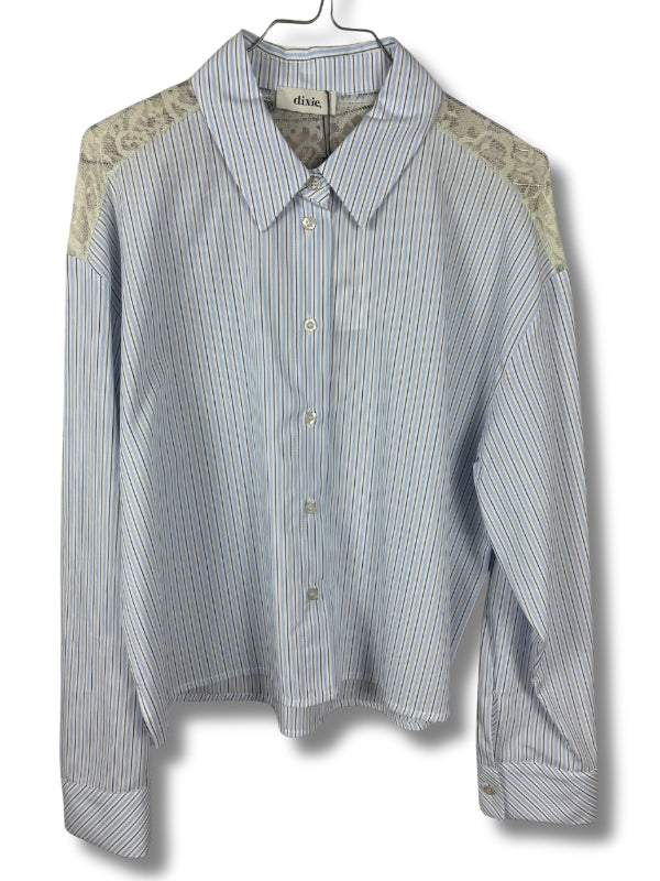 Camicia cropped in popeline di cotone celeste a righe con inserto in pizzo, colletto classico, mancia lunga con polsino.