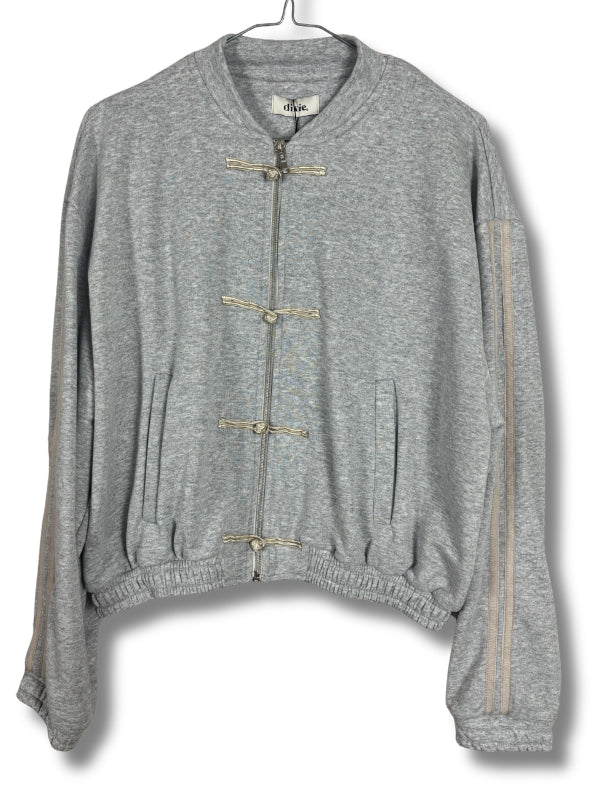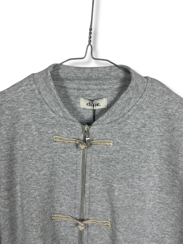 Felpa grigia in cotone, modello corto con alamari e cerniera e bande sulle maniche. Disponibile in più colori.