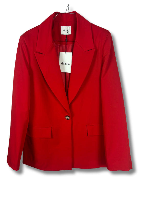 Tailleur rosso composto da giacca monopetto dritta e pantalone dritto. Disponibile in più colori.