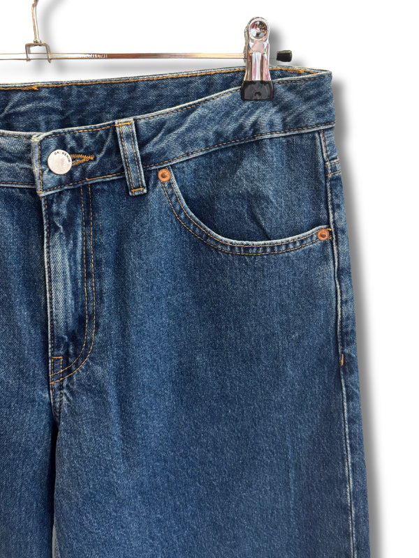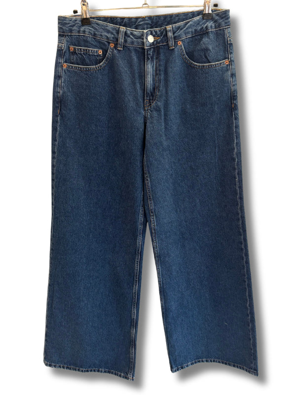Jeans a gamba ampia lavaggio scuro, leggermente flare, tela ferma, vita bassa, cinque tasche.