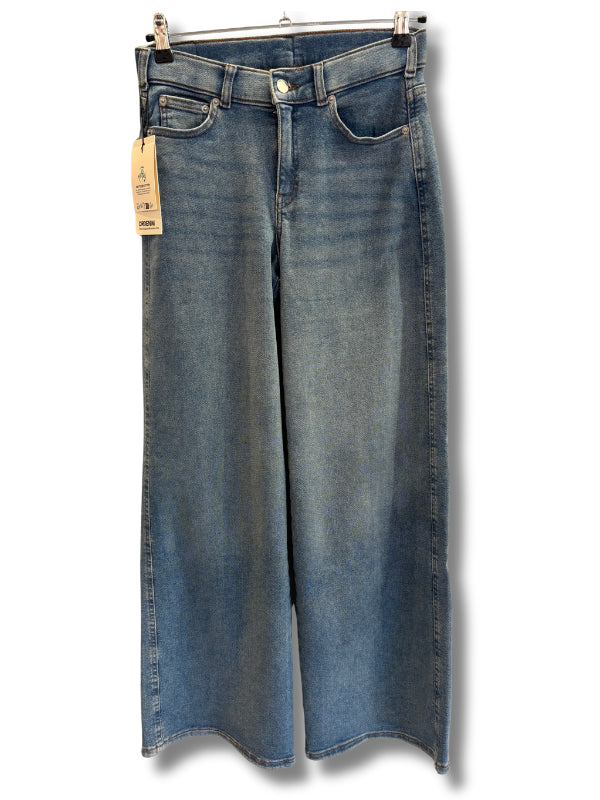 Jeans wide leg in denim elasticizzato, lavaggio chiaro, vita media, gamba larga dritta. Disponibile in più colori.
