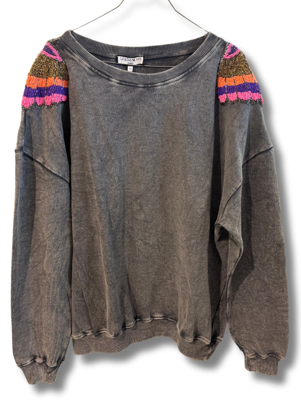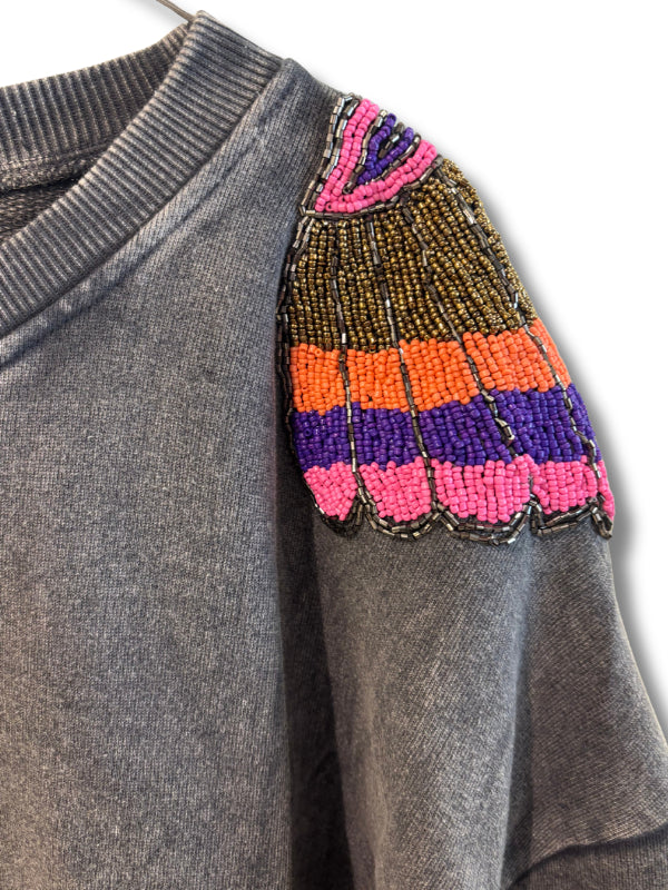 Felpa in cotone grigio delavé con applicazione a conchiglia in perline sulle spalle, girocollo con polsini. Disponibile in più colori.
