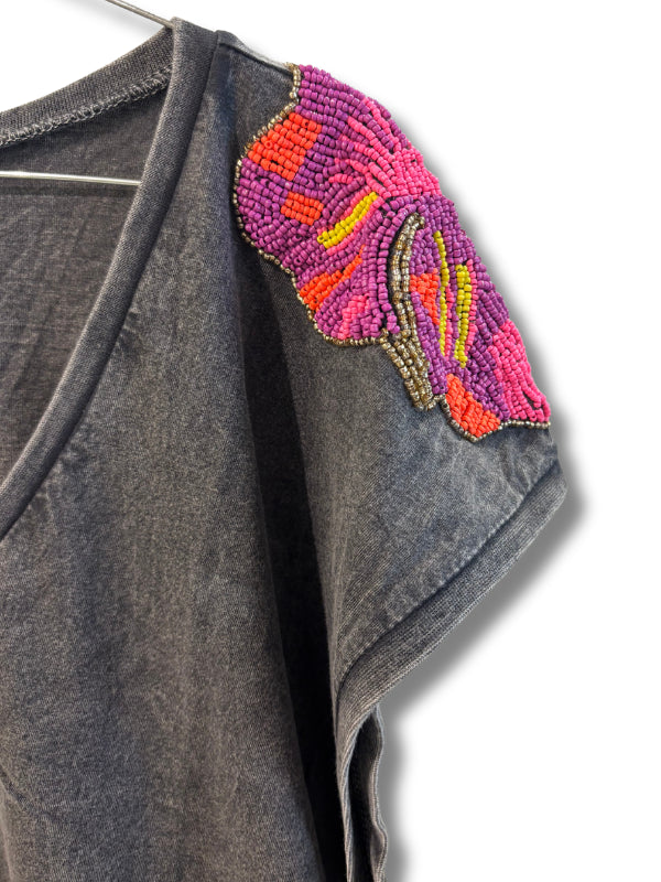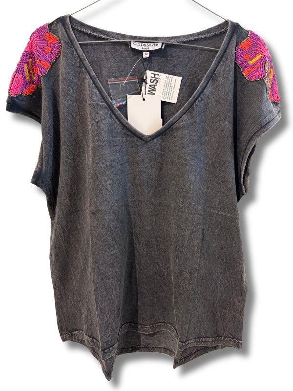 T-shirt in cotone grigio delavé con applicazione a fiore in perline sulle spalle, scollo V, manica corta. Disponibile in più colori.