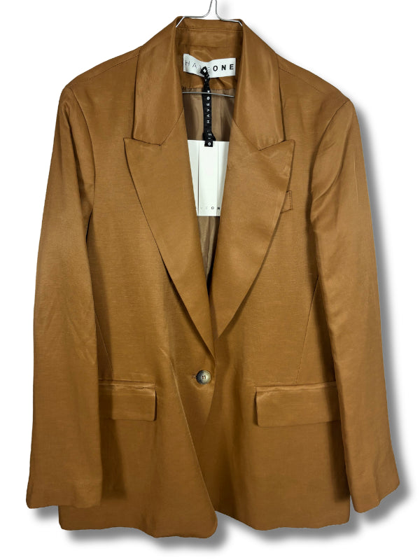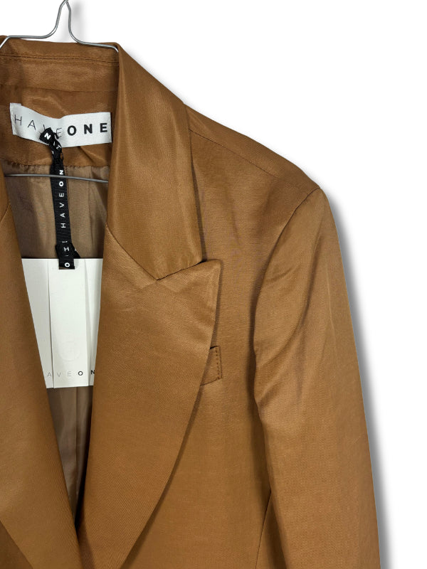 Giacca fluida in viscosa lucida biscotto, modello dritto monopetto. Provala abbinata allo shorts coordinato.