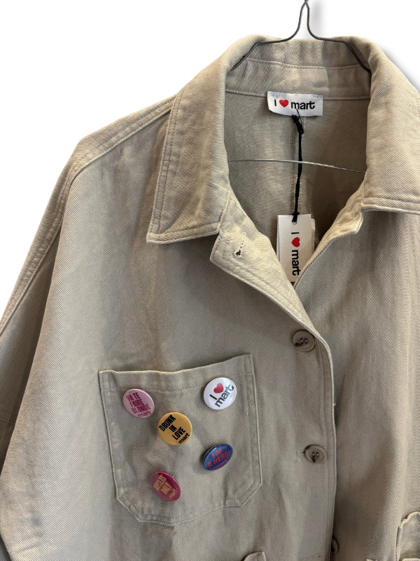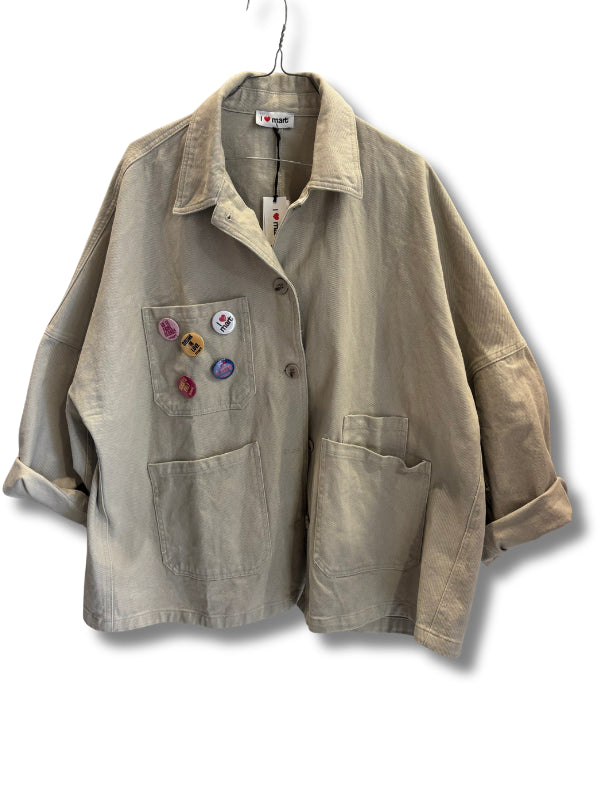 Giubbino modello overshirt in gabardina gesso con spille decorative, con colletto e maxi tasche applicate, manica ampia. Disponibile in più colori.