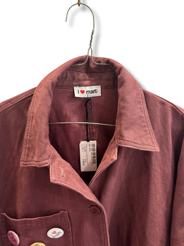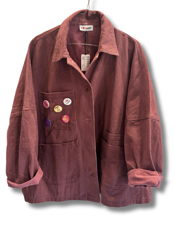 Giubbino modello overshirt in gabardina cipolla con spille decorative, con colletto e maxi tasche applicate, manica ampia. Disponibile in più colori.