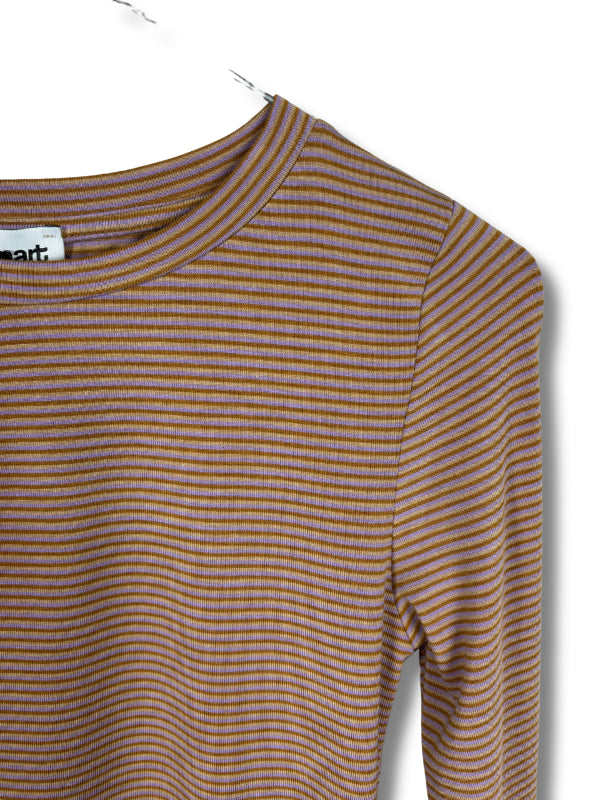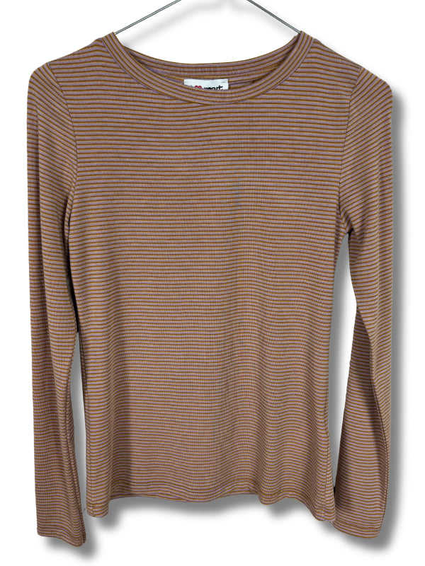 T-shirt slim in jersey a micro righe multicolor base nocciola, girocollo, manica lunga. Disponibile in più colori.