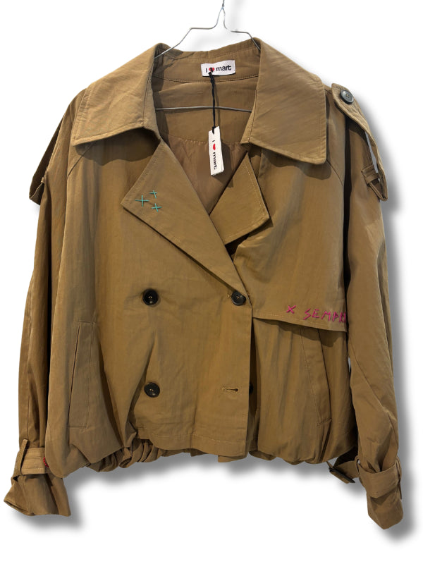 Trench corto in cotone camel con ricami fatti a mano, modello arricciato sul retro effetto bomber. Disponibile in più colori.