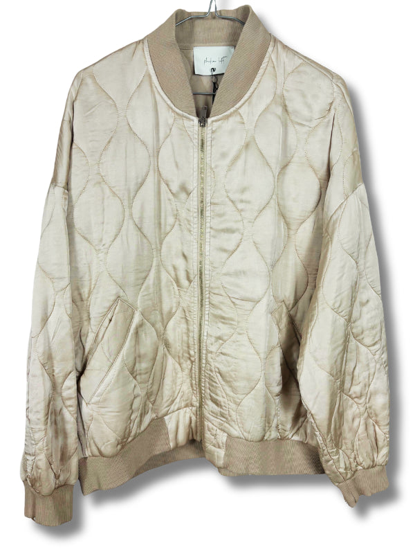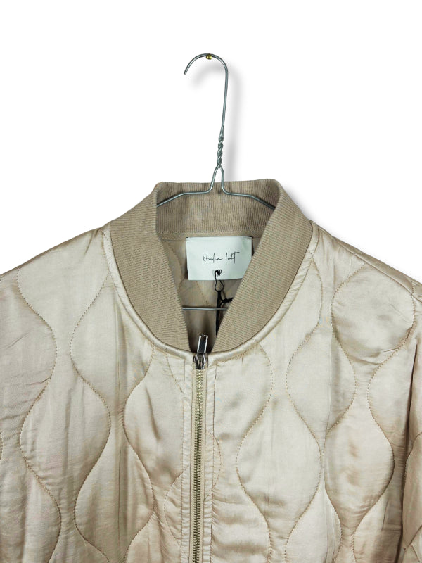 Giubbino bomber in raso trapuntato sabbia, con polsini e colletto, chiusura con cerniera. Disponibile in più colori.
