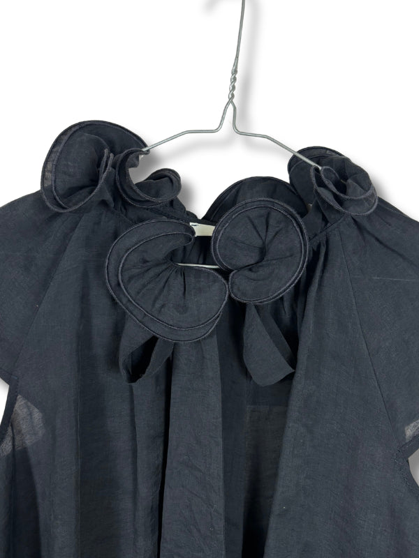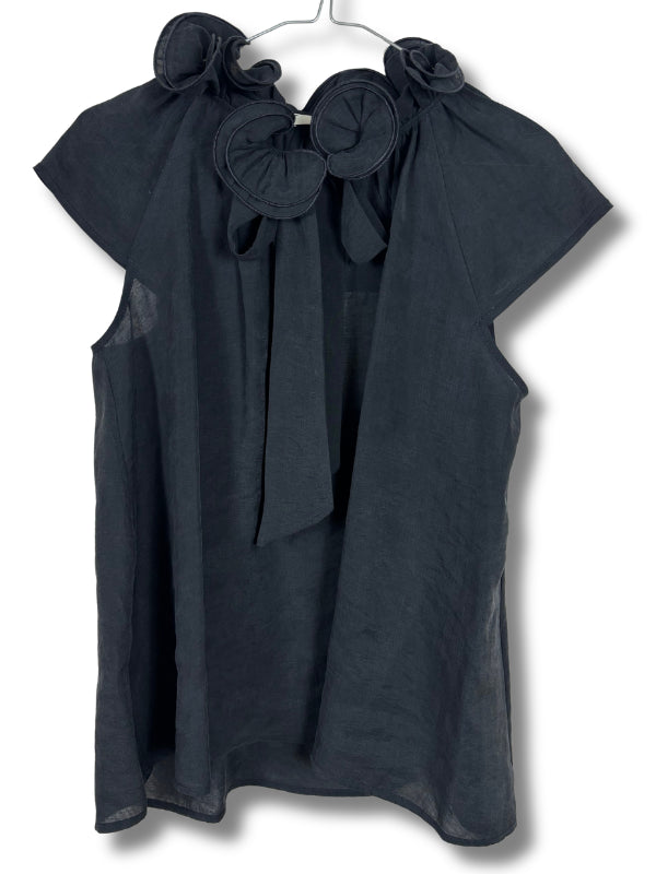 Top nero con manica ad aletta, rouches e fiocco al collo. Disponibile in più colori.