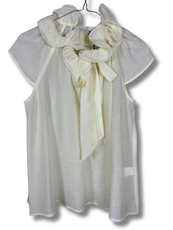 Top panna con manica ad aletta, rouches e fiocco al collo. Disponibile in più colori.