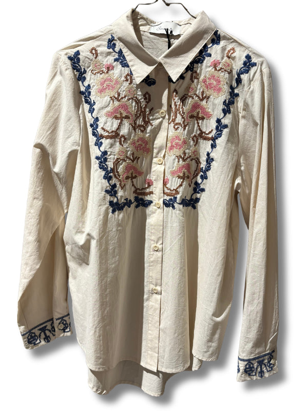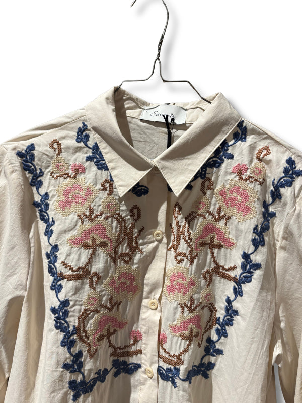 Camicia in cotone panna con ricami a punto croce multicolor.