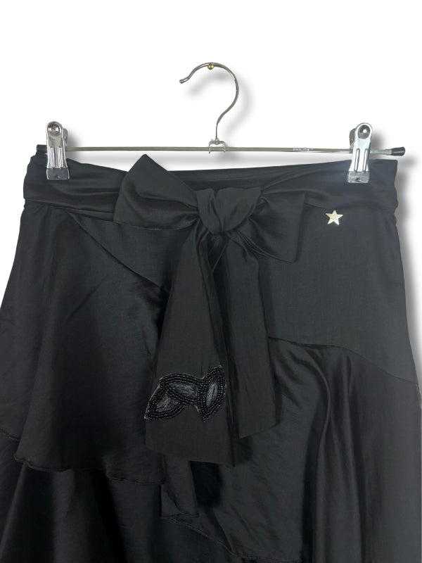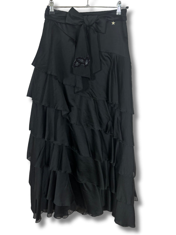 Gonna lunga in mussola di cotone nera, modello a balze con fusciacca.