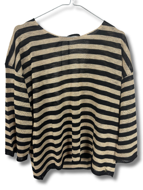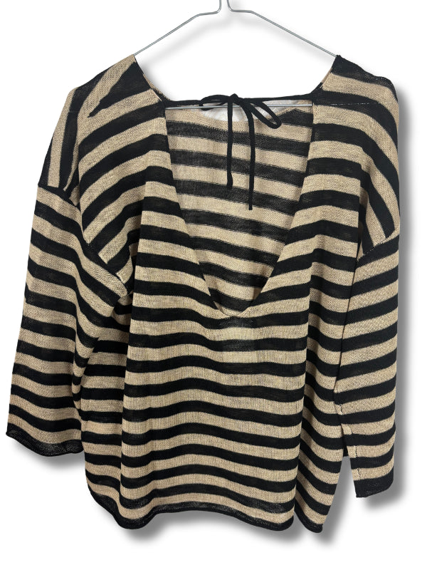 Maglia a scatola in viscosa a righe nero e cammello, scollo tondo e fiocco sul retro. Disponibili in più colori.