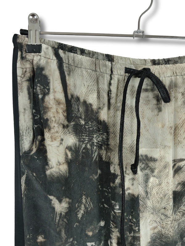 Pantalone palazzo in viscosa nero con fantasia effetto marmorizzato, gamba morbida con banda laterale nera, elastico e culisse in vita. Provalo abbinato al top coordinato.