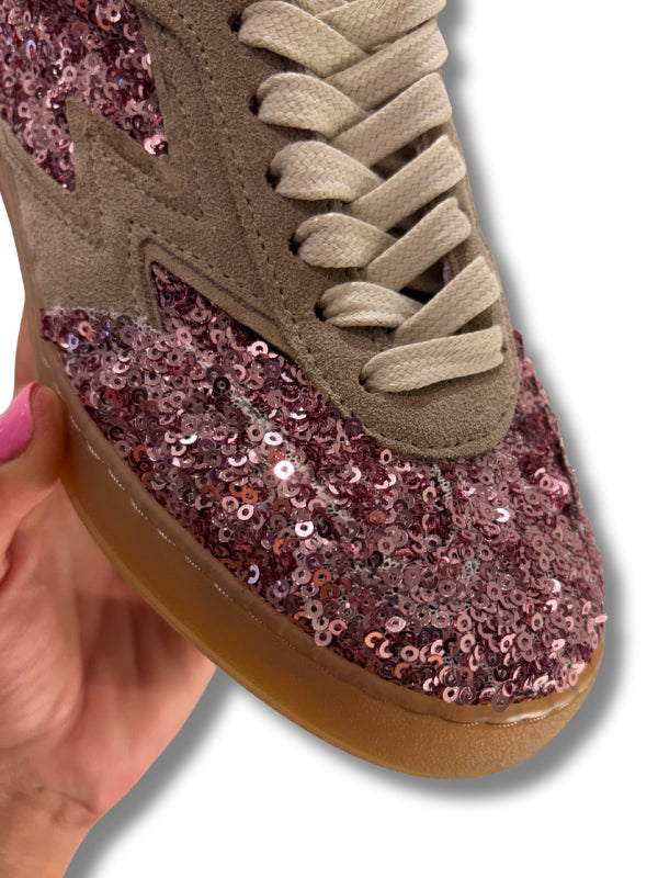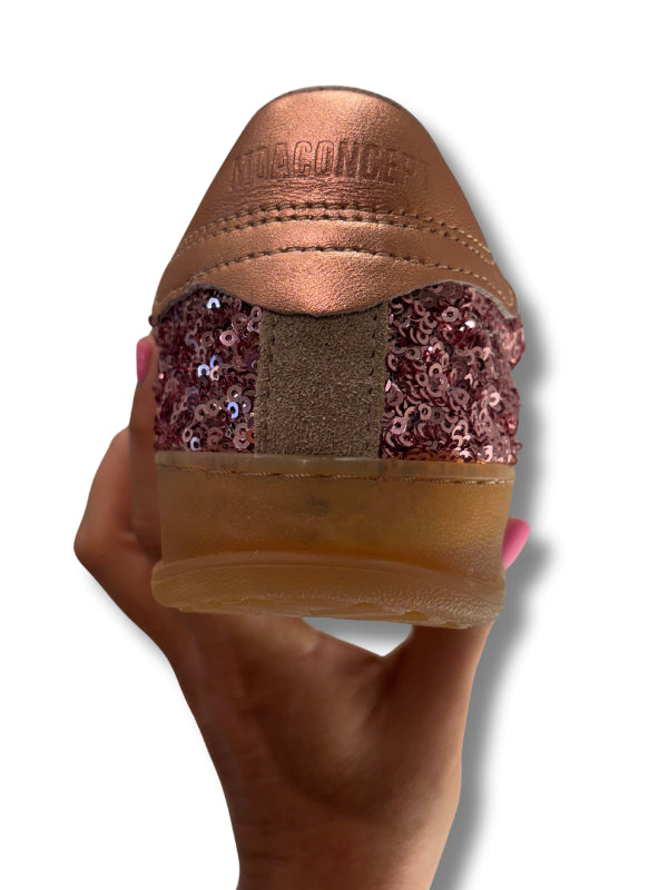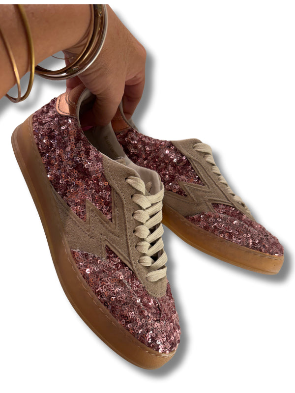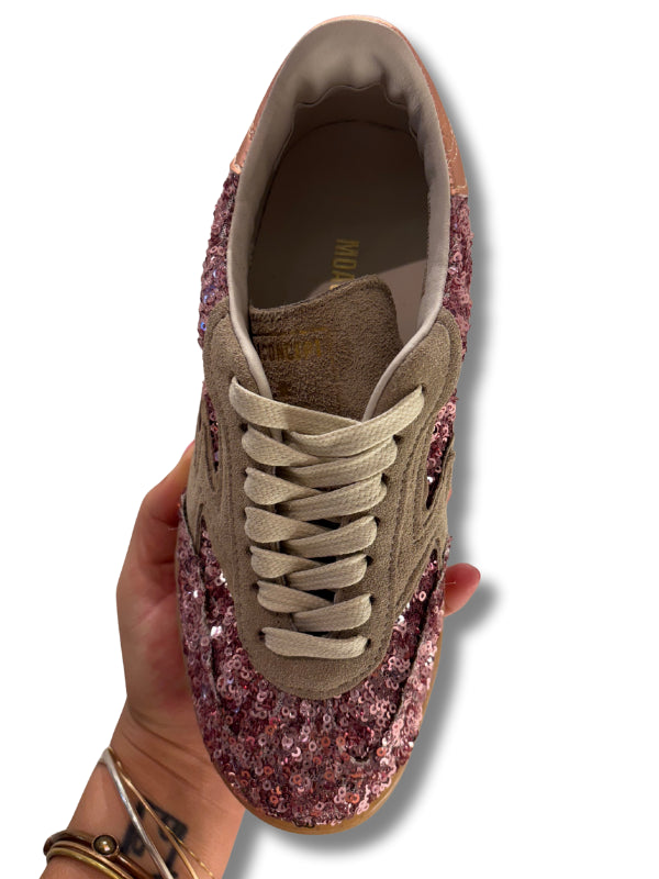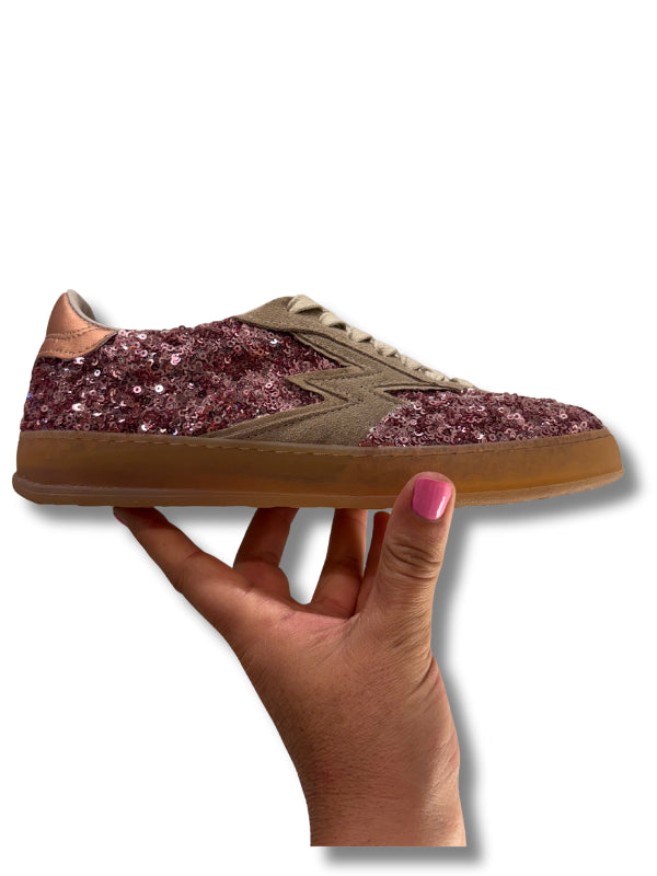 Sneakers bassa in pailletes rosa, con dettagli in nabuk e suede. Suola in gomma miele alta 3,4 cm. Calzata regolare. Made in Italy.