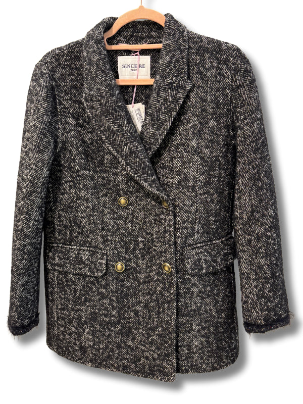 Cappotto corto, 80% lana con trama resca nero e panna, doppiopetto e passamaneria sui polsi.