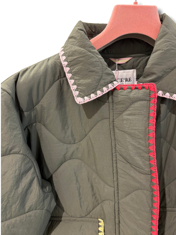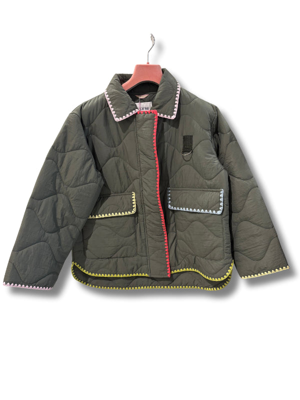 Giubbotto trapuntato militare con profili colorati, tasche a pattina, modello over.