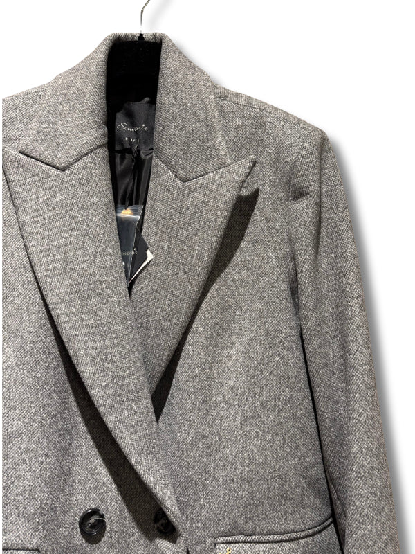 Cappotto lungo over grigio, doppiopetto con revers a lancia, con spacco dietro e fodera interna.