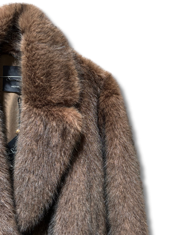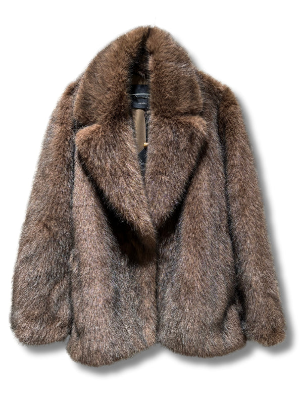Giubbotto in eco pelliccia moro, modello over con maxi revers, chisura con bottoni a pressione.