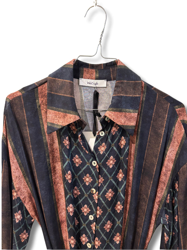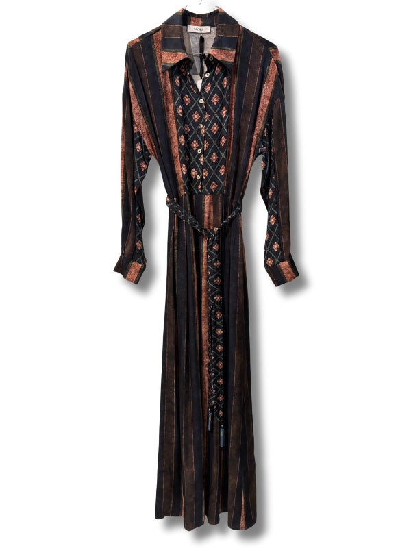 Abito cehmisier lungo in viscosa blu fantasia a righe e floreale, colletto a camicia, cinturino in vita.