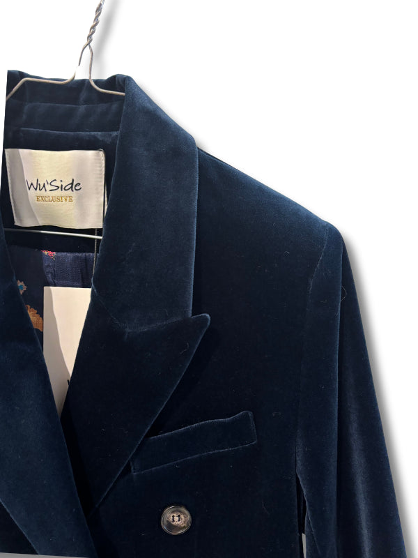 Giacca in velluto liscio blu con fodera in viscosa a contrasto, doppiopetto con revers a lancia e tasche a pattina.