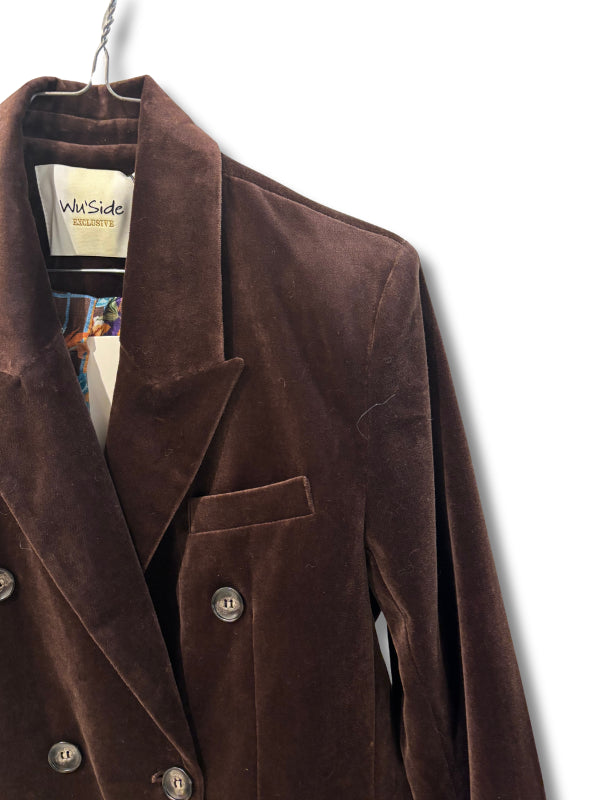 Giacca in velluto liscio cioccolato con fodera in viscosa a contrasto, doppiopetto con revers a lancia e tasche a pattina.