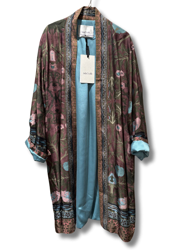 Kimono lungo fantasia multicolor in viscosa base verde con fodera in raso a contrasto, modello senza chiusure, collo sciallato, con tasche.