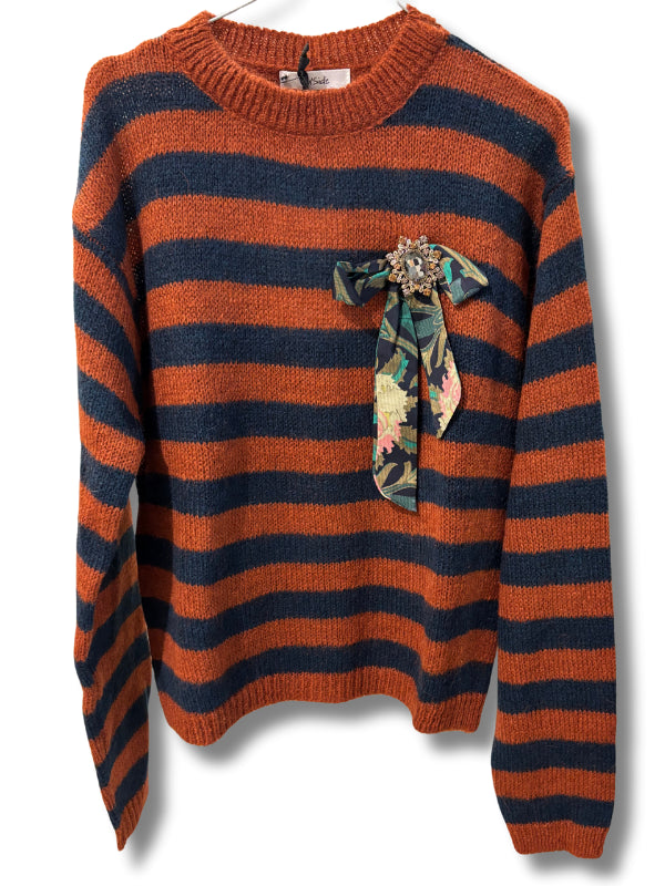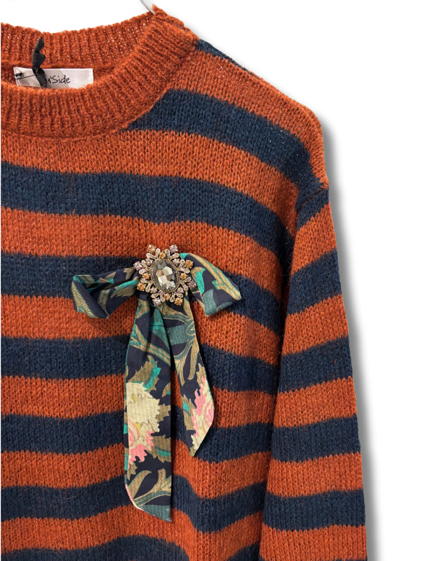 Maglia a righe tabacco e blu in misto alpaca con spilla decorativa.
