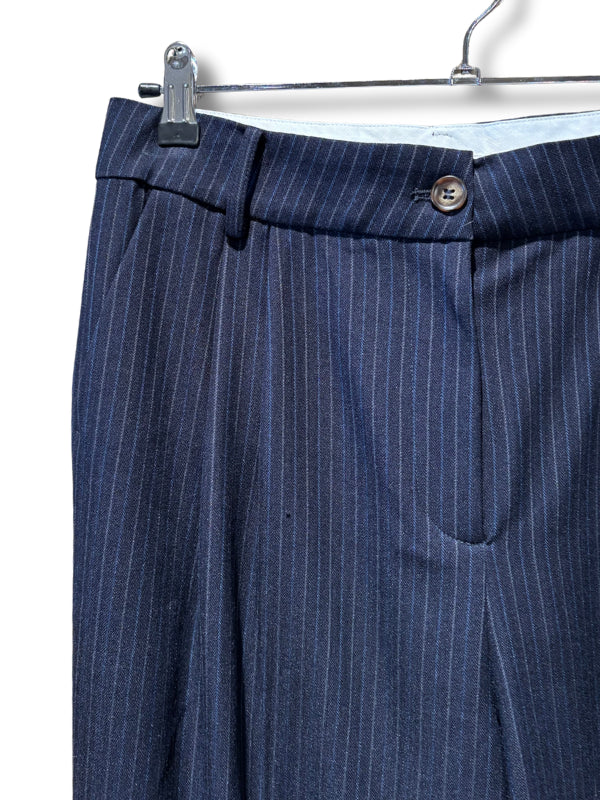 Pantalone in panno blu gessato, modello dritto a uomo con pinces.