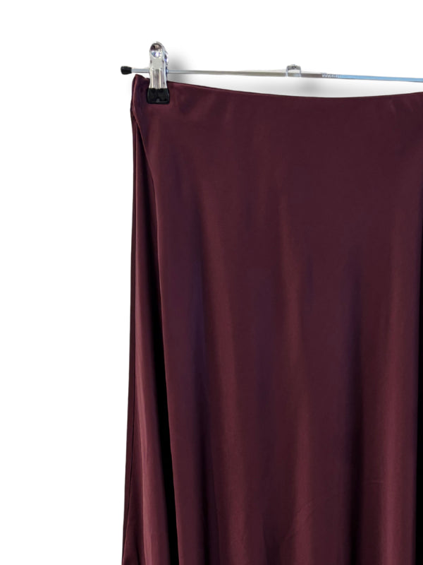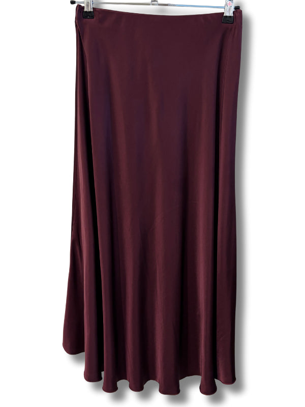 Gonna midi in raso amarena, modello svasato con elastico in vita. Disponibile in più colori.