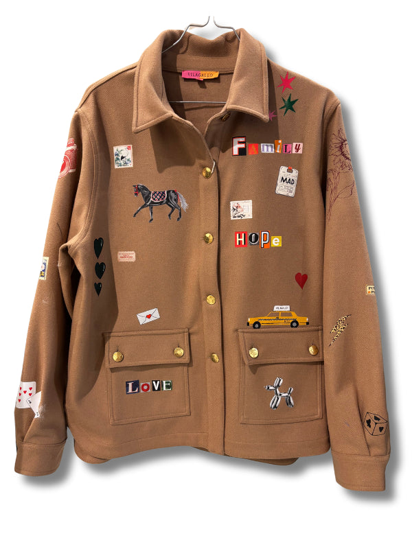 Overshirt misto lana camel con stampe colorate miste, bottoni dorati e tasche a pattina.